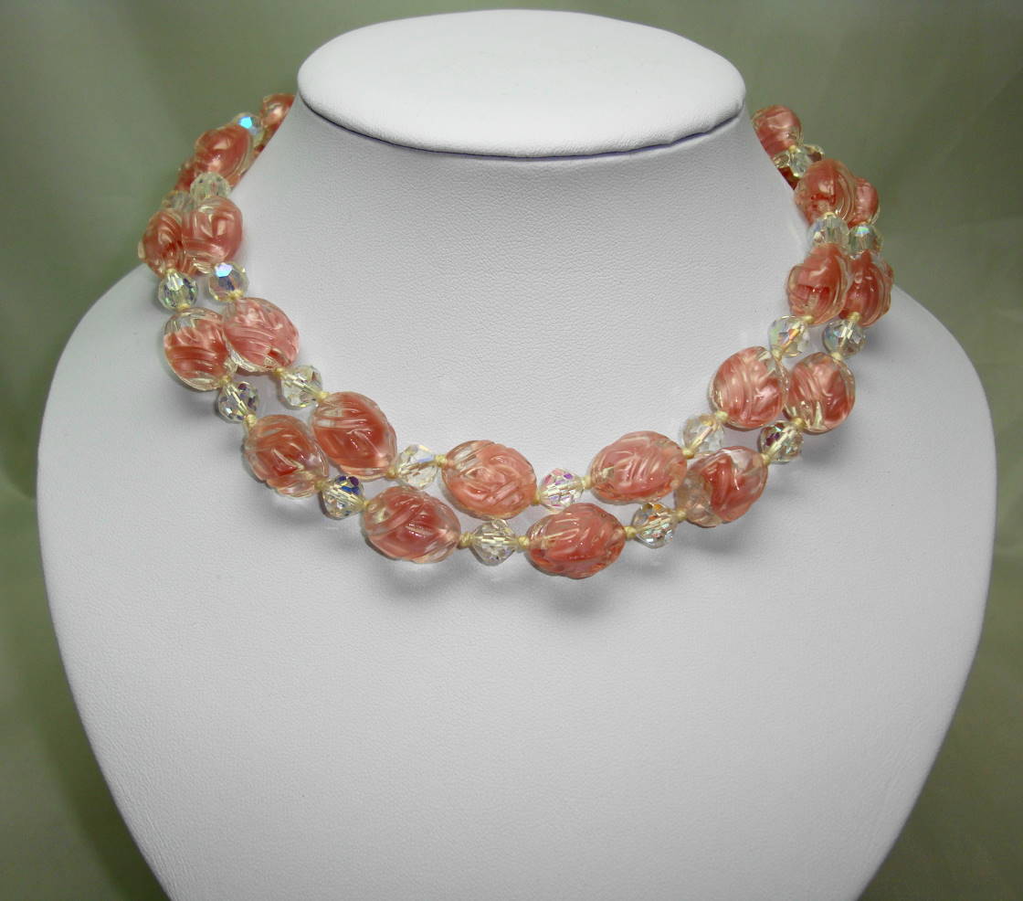 1930s 2 Row Pink and Clear Swirl Art Glass AB Crystal Bead Necklace