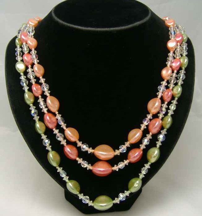 1950s 3 Row Green & Coral Pearl & Crystal Bead Necklace