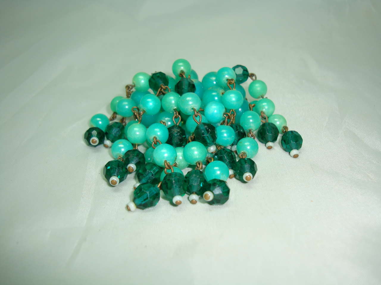 We are pleased to offer this fabulous vintage 1950s shades of green lucite and crystal glass bead tassel drop brooch which is just stunning.  As you can see from the photos, the brooch is in excellent condition, looks amazing on, a real stunner!  A great mix of lucite and crystal glass beads, fabulous green colour, the photos do not do this brooch justice.