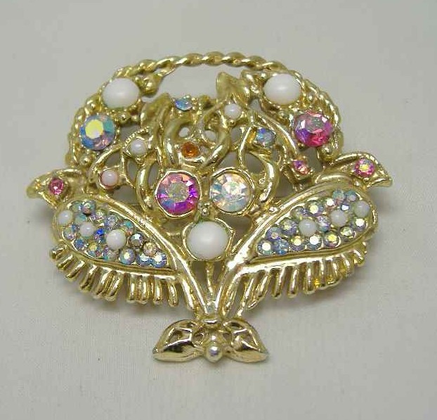 1950s Large AB Diamante Flower Basket Gold Brooch WOW