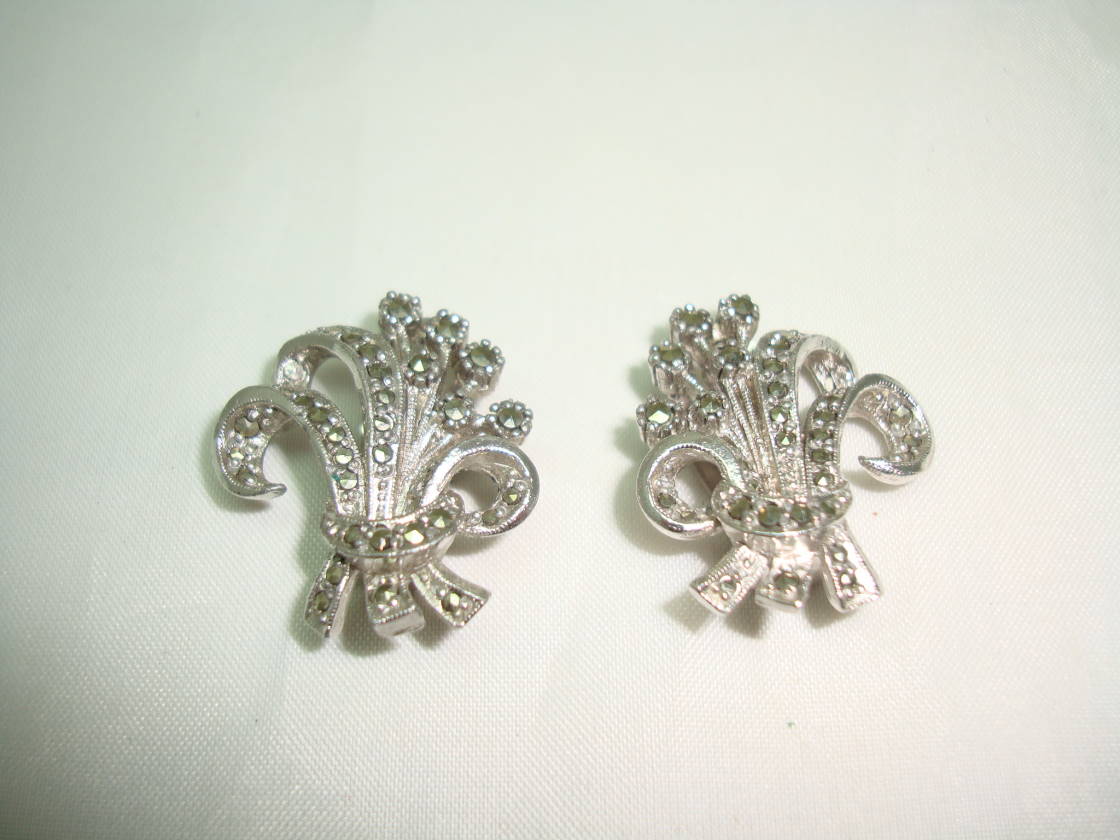 We are pleased to offer this pair of vintage 1950s sparkling marcasite silvertone floral bouquet design silvertone clip on earrings by Sphinx.  As you can see from the photos, the earrings are in excellent condition, stamped Sphinx on reverse of earrings, looks really fabulous on, a great vintage pair of earrings.