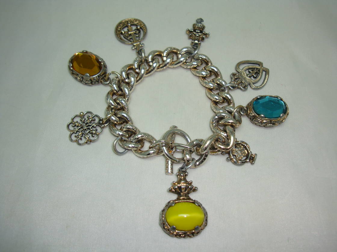 1950s Unique and Fabulous Chunky Glass and Goldtone Charm Bracelet