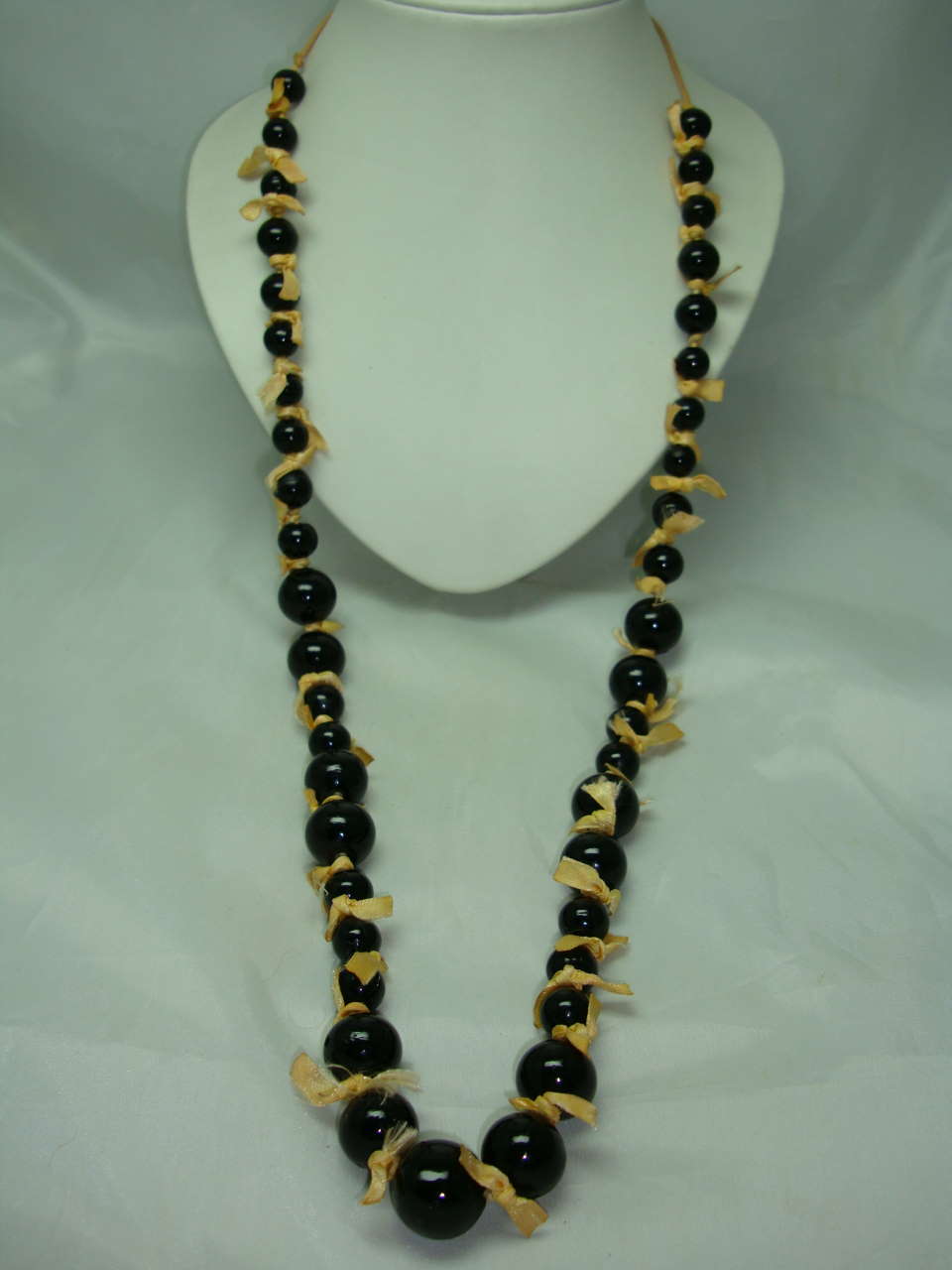 1970s Style Long Black Glass Bead Necklace with Bows!