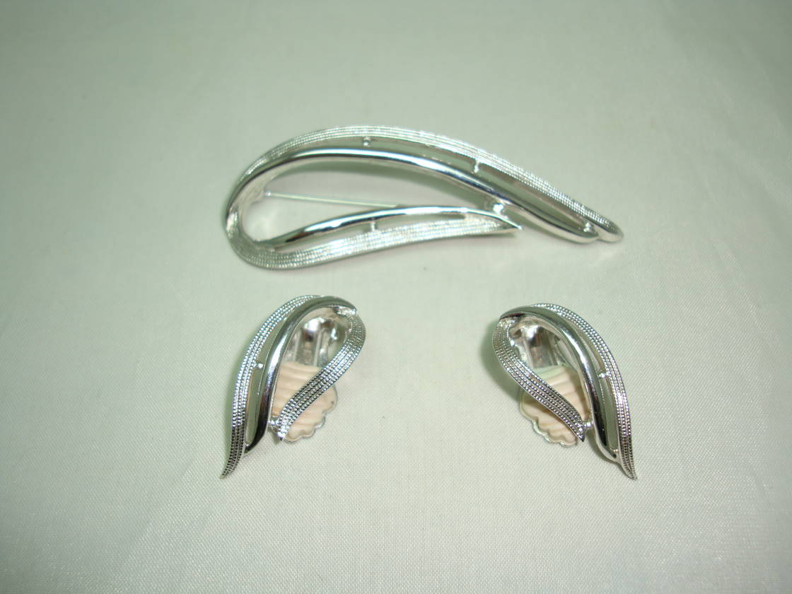 We are pleased to offer this quality vintage 1960s demi parure signed Sarah Cov stylised openwork swirl design silvertone brooch and matching clip on earrings, this style was called "Stunning".  As you can see from the photos, the set is in excellent condition, brooch stamped Sarah Cov Canada on reverse and earrings are stamped Sarah Cov Pat. Pend. on back of clips - earrings measures 1 ½ inches in length by ½ inch.  Looks really stylish and elegant on, great quality and fabulous finish.