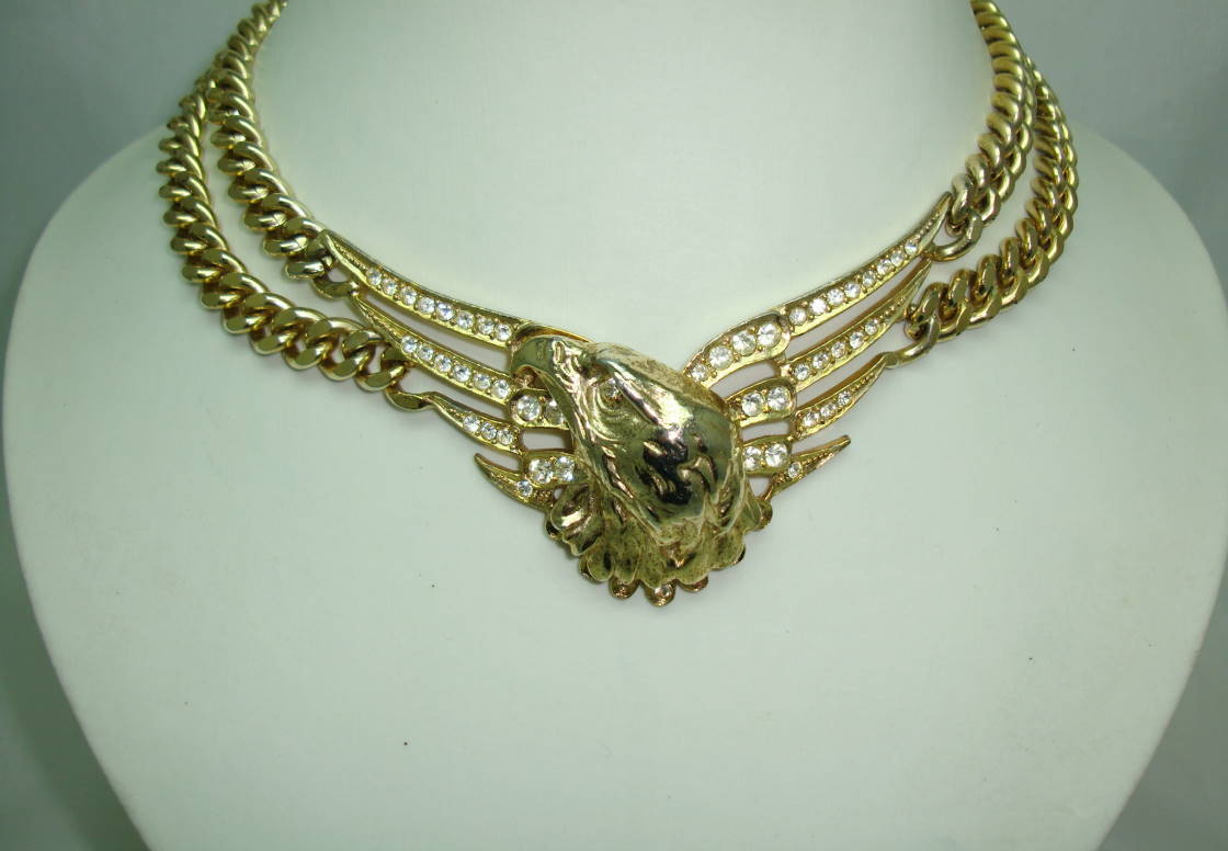 Fabulous rare vintage 1980s Butler & Wilson liberty eagle head diamante two row chunky chain gold plated necklace which is absolutely stunning.  Excellent vintage condition, looks really fabulous on, a great vintage Butler and Wilson piece - stamped B & W on reverse with registration number 30589. This really is a weighty piece, so very rare to come across a vintage Butler and Wilson piece which is both rare in design and also which is in great condition.