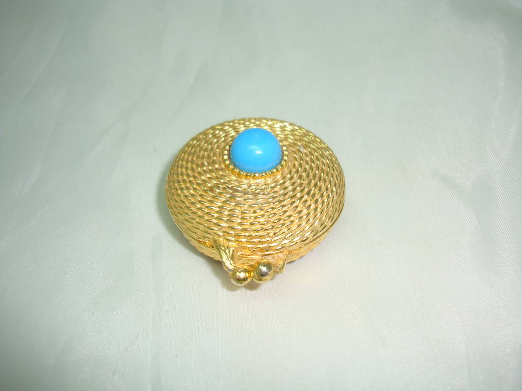 VINTAGE 1980s COLLECTIBLE ESTEE LAUDER GOLDTONE PILL BOX - INSIDE IS MARKED: ESTEE LAUDER.  THIS IS A LOVELY ROUND ROPE GOLDTONE PERFUME/PILL BOX WITH A LARGE TURQUOISE BLUE GLASS STONE - OPENS/CLOSES LIKE IT SHOULD.  A VERY PRETTY PIECE IN FABULOUS CONDITION MEASURES APPROX. 1 5/8" ~ 4CM DIAMETER (NOT INCLUDING HANDLE) .75" ~ 2CM HEIGH.  ORIGINALLY HAD PRESSED PERFUME IN IT - YOUTH DEW BY THE SMELL OF IT!