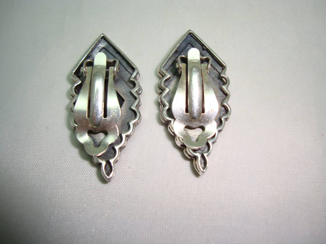 Art Deco Style Sterling Silver Black Onyx + Marcasite Clip on Earrings