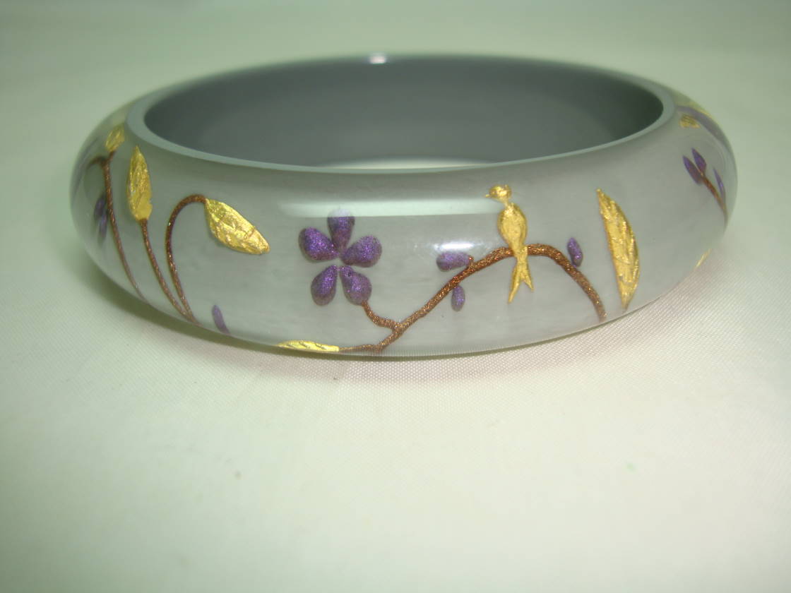 We are pleased to offer this fabulous designer hand made bangle by Dutch designer Zsiska in grey, gold and purple lucite in a floral and bird design.  As you can see from the photos, the bangle is in excellent condition as it is a modern new piece.  This is from Zsiska's Hanami collection, very unusual and unique.