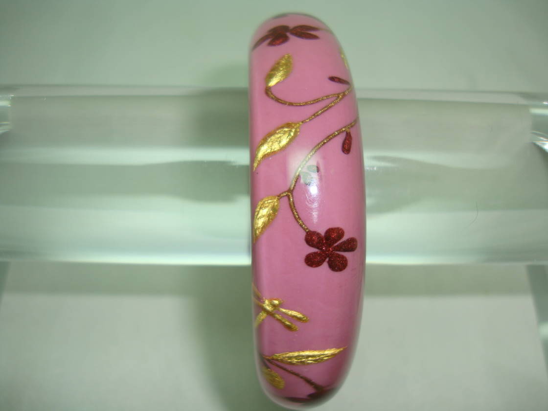 We are pleased to offer this fabulous designer hand made bangle by Dutch designer Zsiska in pink, gold and red lucite in a floral and bird design.  As you can see from the photos, the bangle is in excellent condition as it is a modern new piece.  This is from Zsiska's Hanami collection, very unusual and unique.