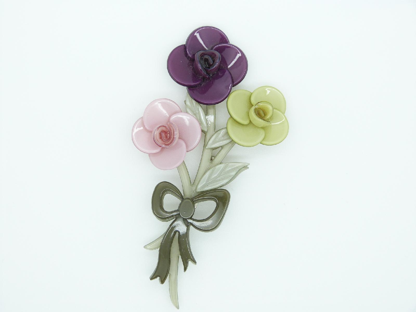 Big Baby pretty posey of roses brooch.  Acrylic. Very detailed with 3-D roses. The brooch measures 8.5cm/85mm (length) x 5cm/50mm (widest point). Pin with roll-over catch, new so in mint condition.