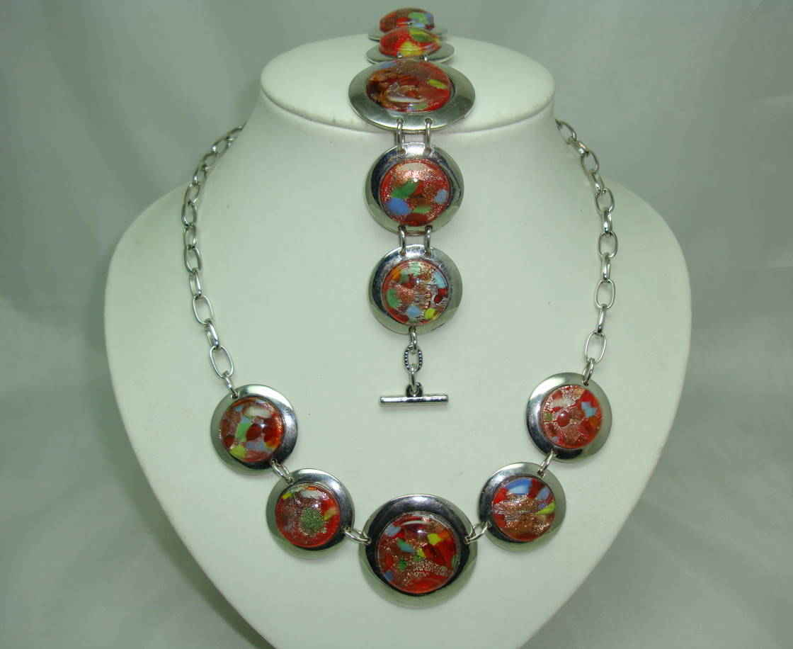 We are pleased to offer this fabulous chunky red murano glass circles silvertone necklace and matching bracelet set.  As you can see from the photos, the necklace and bracelet is made up of graduating round domed red Murano multicoloured glass shot with gold sparkle on silvertone chain.  This really is a very well made, quality modern piece, very 60s in design, excellent condition as set has never been worn, a really upmarket 21st century set. This set has a really good weight to it as well, scream quality.