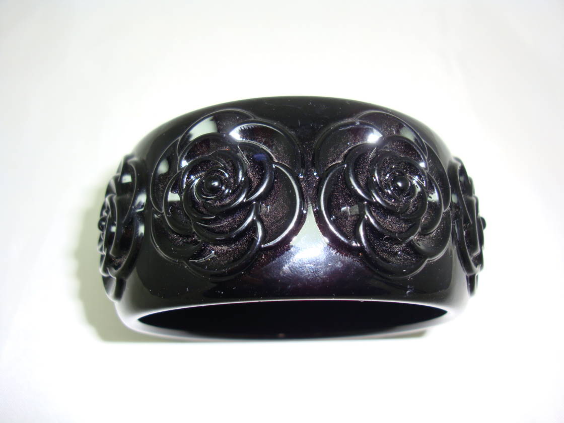 We are pleased to offer this chunky wide black lucite/plastic cuff bangle with a carved rose design which is just stunning.  As you can see from the photos, the bangle is in excellent condition as it is a modern piece, looks stunning on, a real statement piece, will go with absolutely anything.