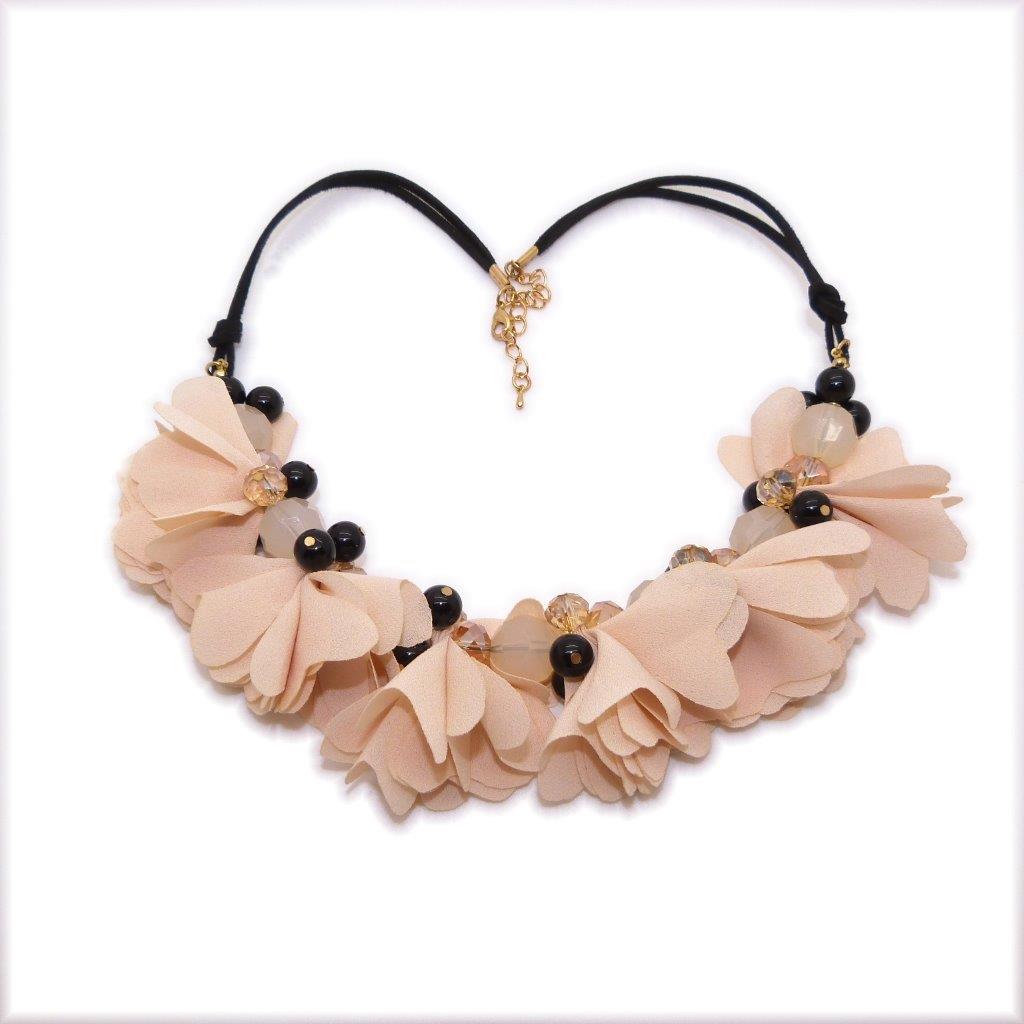 Very pretty pale peach nude coloured flower necklace made up of silky material petals, black and opaline coloured acrylic beads and sparkling faceted glass peach coloured beads. Fastens with lobster claw clasp with extender chain for extra length. A beautiful necklace which will go with practically anything. Fab condition - measurement includes extender chain.