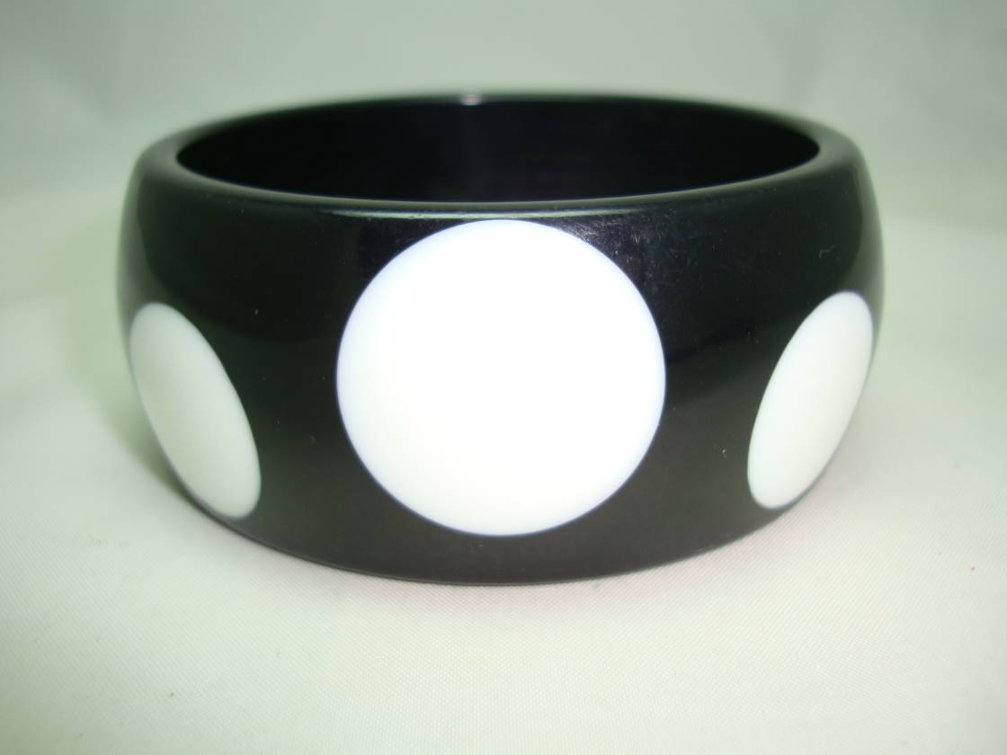 Fab and fun chunky wide black plastic bangle featuring large white polka dots.  Excellent condition, looks stunning on, quirky and unique.