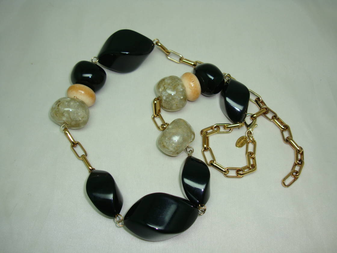 We are pleased to offer this quality signed Jaeger contemporary chunky black, taupe and cream lucite bead necklace on chunky goldtone chain.  As you can see from the photos, the necklace is in excellent condition as necklace is a modern piece, fabulous quality as you would expect from Jaeger, a really stunning necklace that will go with practically anything, a timeless classic!