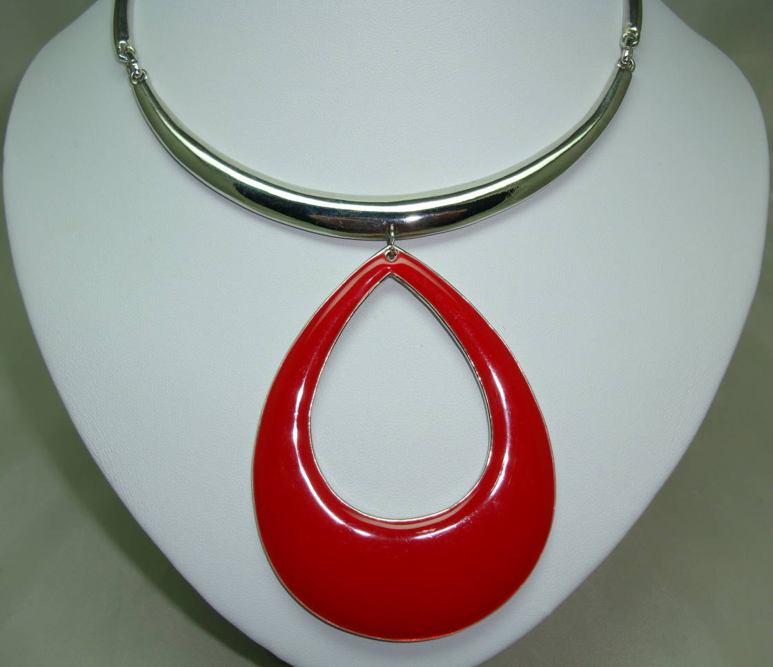 We are pleased to offer this fabulous contemporary silvertone torque collar necklace with a stunning oversized red enamel teardrop shaped pendant.  As you can see from the photos, the necklace is in excellent condition as necklace is a modern piece.  Very well made and good quality, looks amazing on, a real eye catching piece!