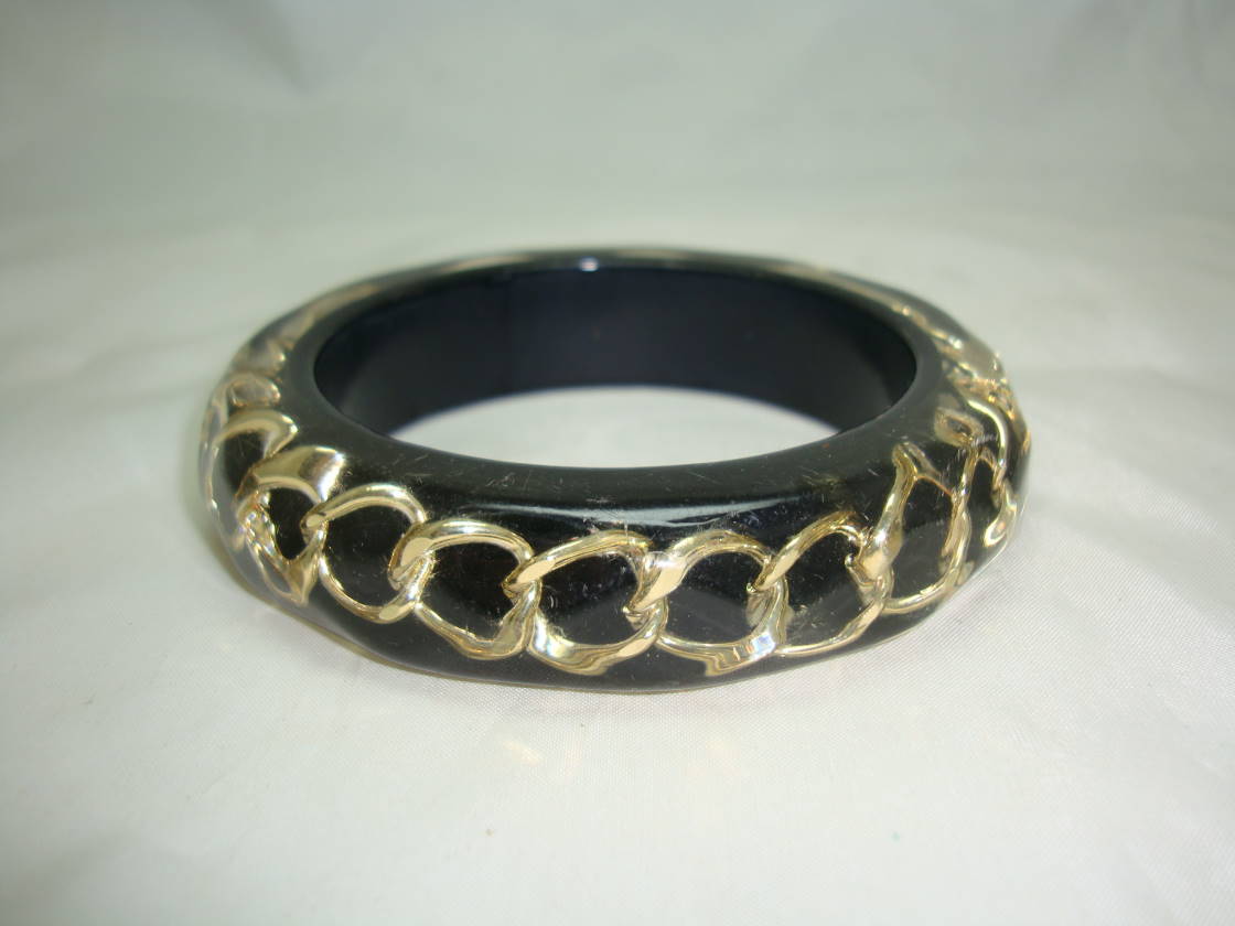 Stylish and Unusual Black and Clear Lucite Gold Chain Inset Bangle