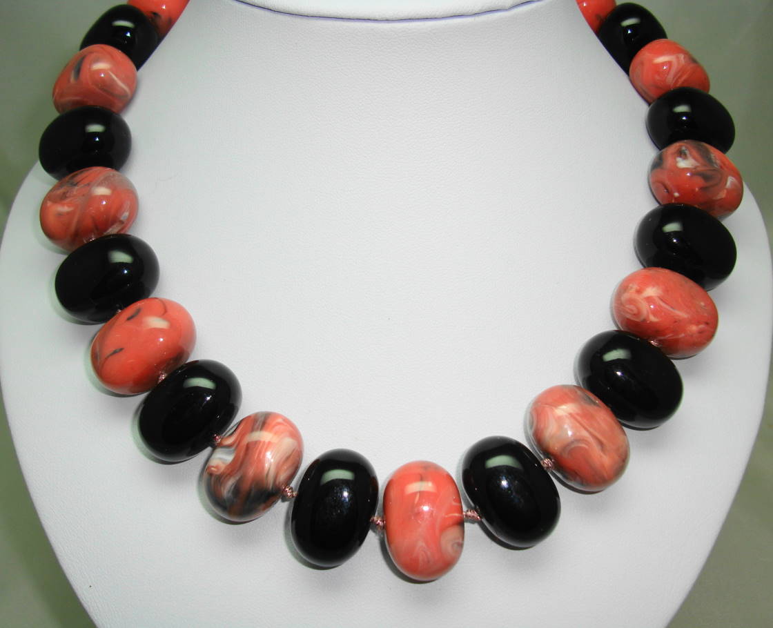Unique Black and Salmon Pink Marble Effect Chunky Lucite Bead Necklace