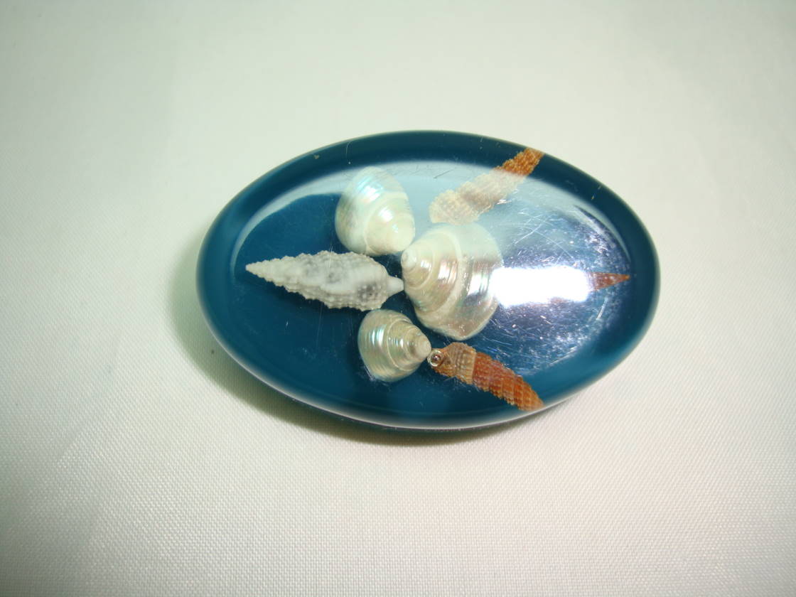 We are pleased to offer this fabulous vintage 1950s large chunky oval shaped sea foam green lucite brooch set with shells.  As you can see from the photos, the brooch is in excellent vintage condition, looks really fab on, a quirky, unique vintage brooch.  (The brooch looks blue in photos but is actually green as stated).