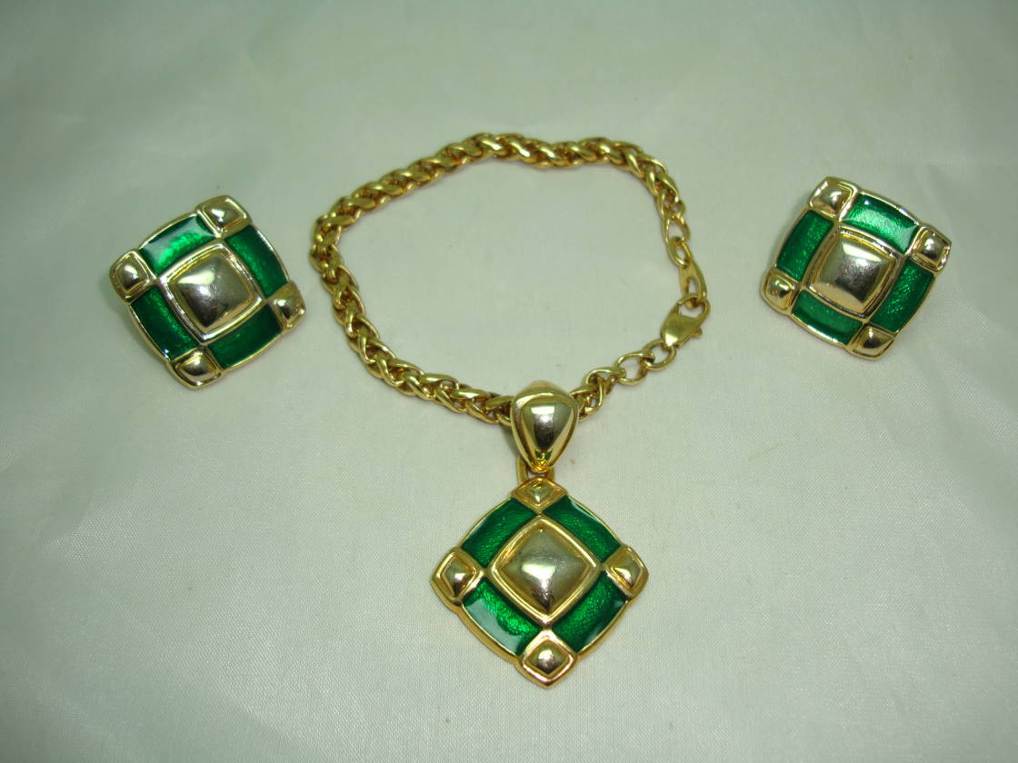 Vintage 1980s Fab Green Enamel and Gold Earrings and Bracelet Set