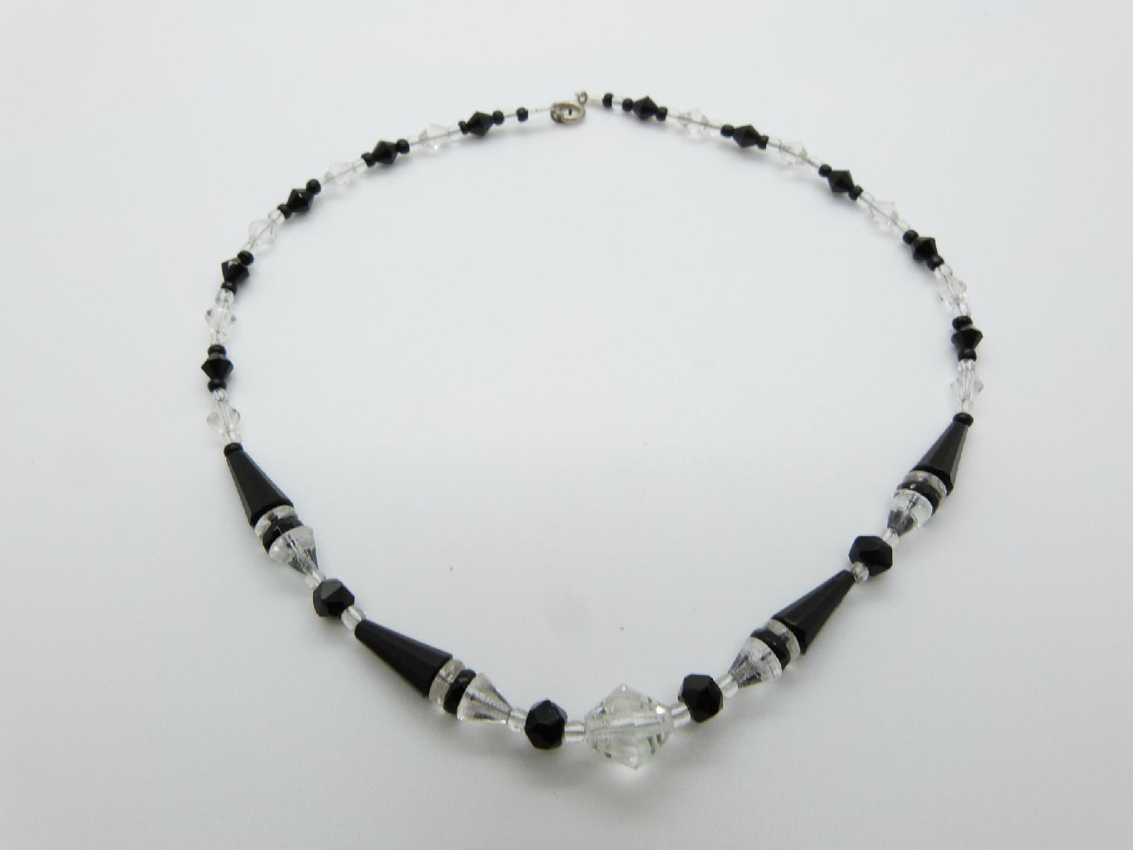 Vintage 30s Art Deco Black and Clear Crystal Glass Geometric Bead Necklace 44cms