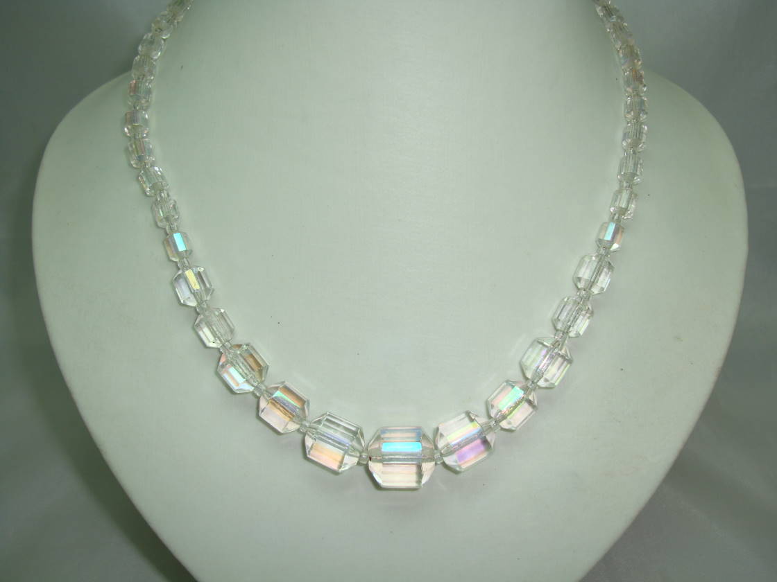 Vintage 30s Beautiful AB Crystal Glass Barrel Shaped Bead Necklace