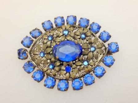 Vintage 30s Czech Filigree Blue Paste Diamante Flower Design Brooch 6cms