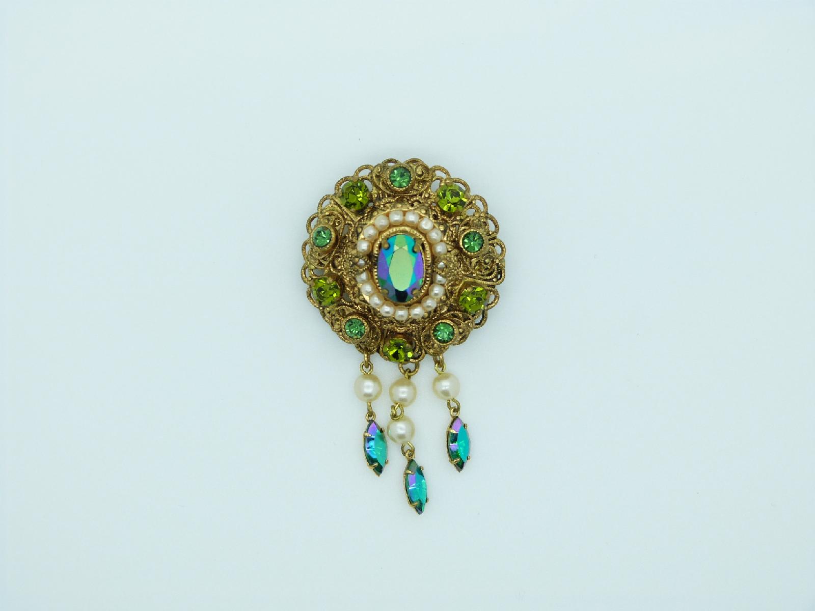 Vintage 30s pretty Czech filigree design goldtone dropper brooch set with green ab diamantes stones and faux pearl, excellent condition, roll over clasp fastener, measures 6cms in length.