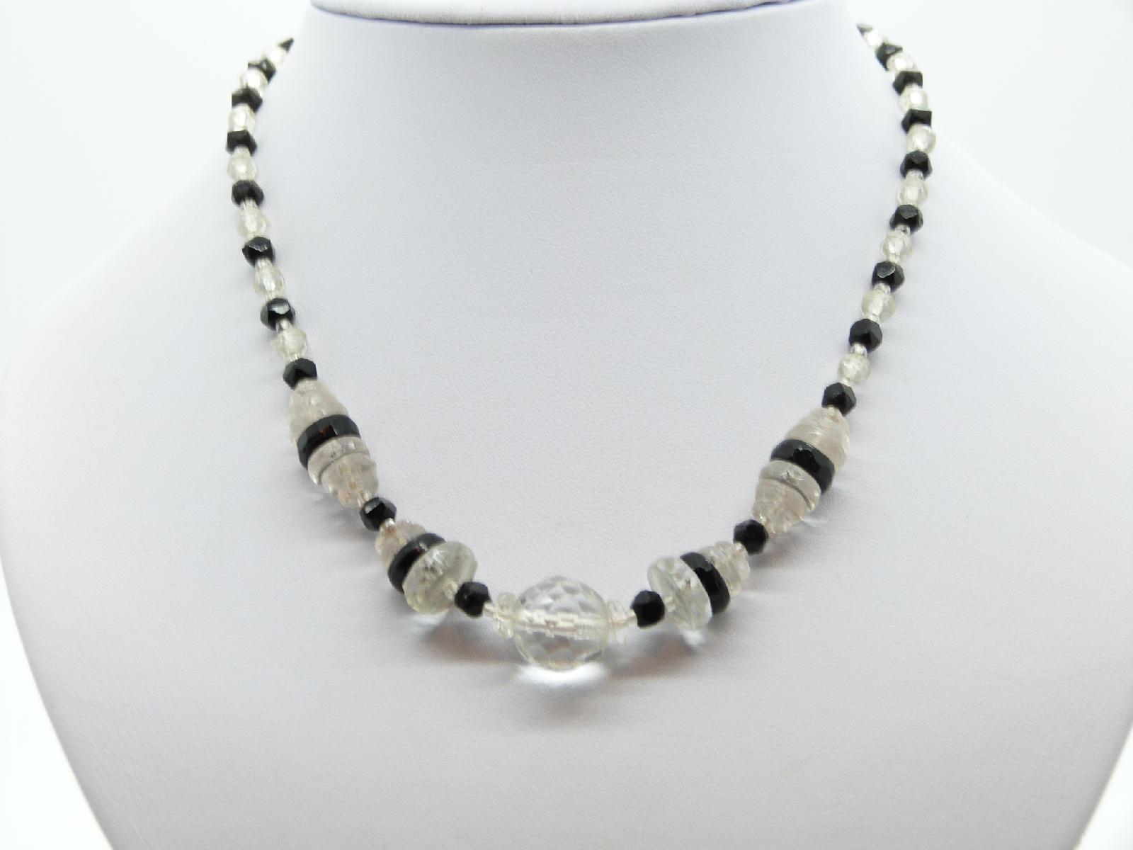 Vintage 30s Geometric Art Deco Black and Clear Glass Crystal Bead Necklace