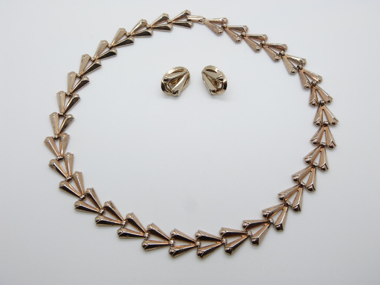 Vintage 30s Lovely Rose Gold Plated Geometric Design Link Necklace and Clip On Earrings Set
