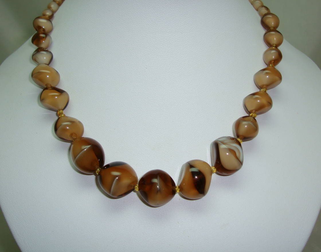 Vintage 30s Unique Mink Brown Art Glass Swirl Bead Graduating Necklace