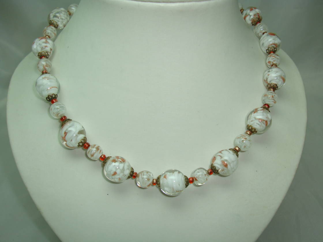 Vintage 30s Venetian Sommerso White and Gold Art Glass Bead Necklace