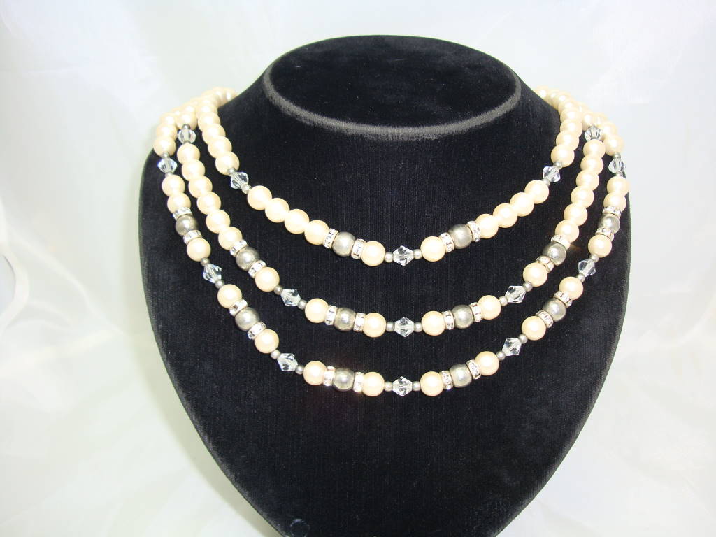 Vintage 50s 3 Row Faux Pearl & Diamante Bead Necklace