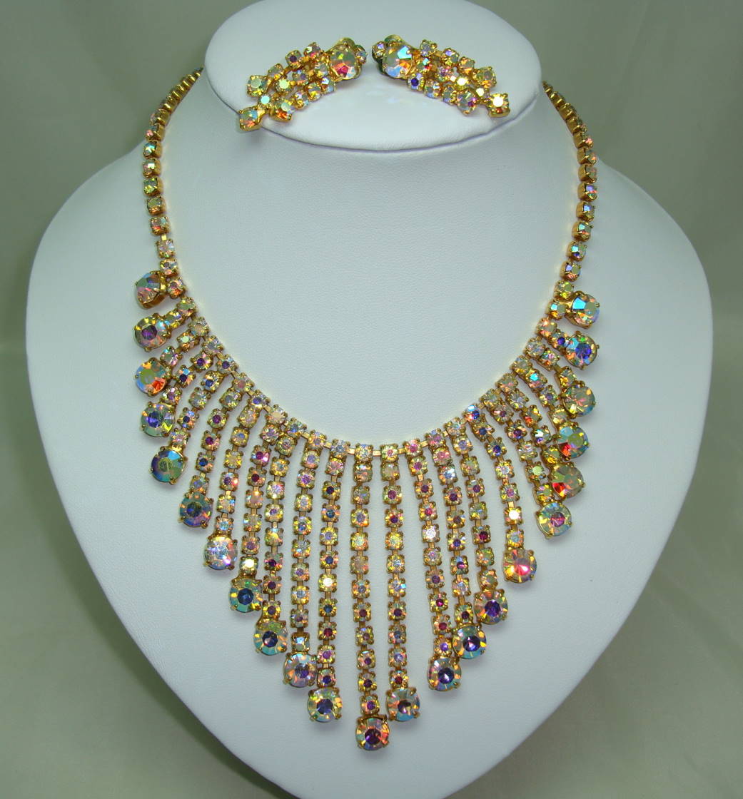 Vintage 50s Amazing AB Diamante Festoon Bib Drop Necklace and Earrings