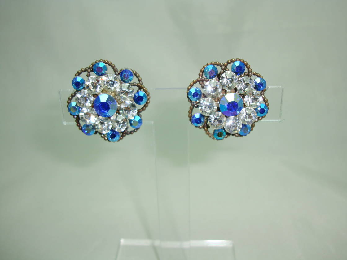 Vintage 50s Blue & Clear Diamante Flower Clip On Earrings