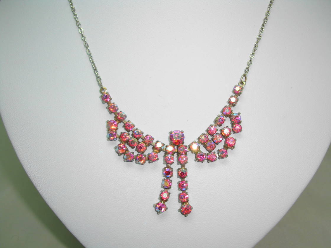 Vintage 50s Charming Pink AB Diamante Rhinestone Bow Drop Necklace