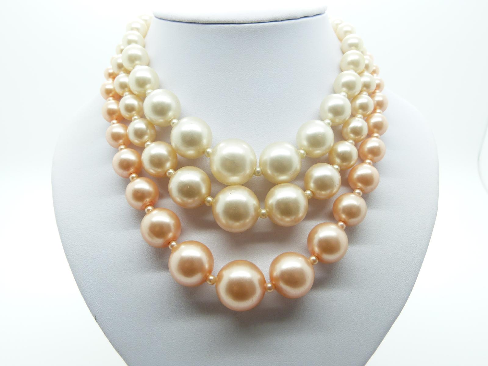 Vintage 50s Chunky Three Row White and Pink Faux Pearl Bead Necklace 47cms