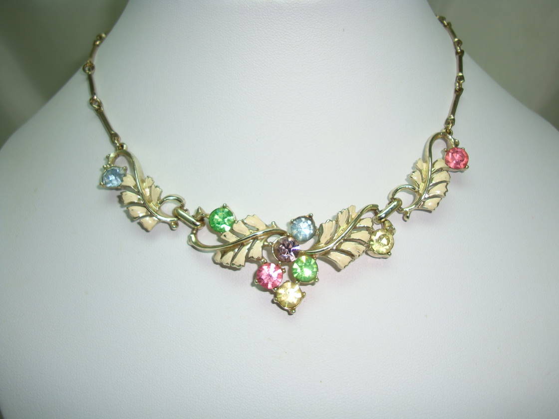 Vintage 50s Cream Enamel Floral Link Multicoloured Diamante Necklace