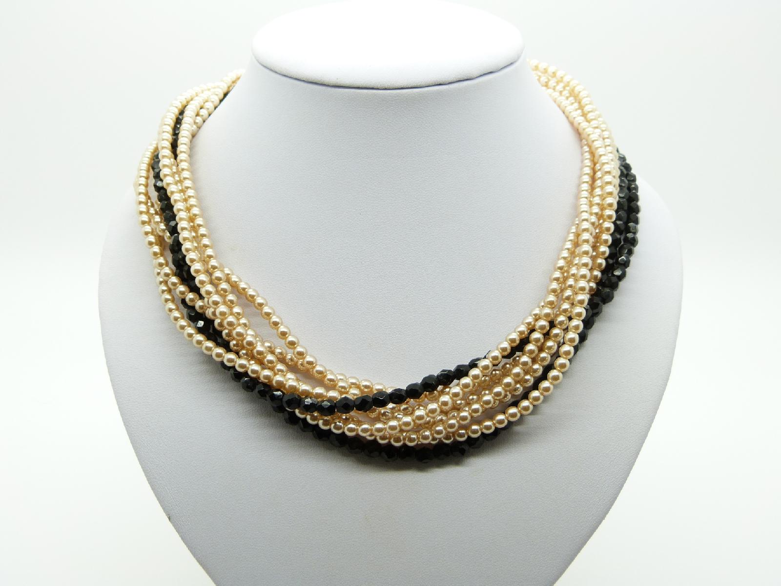 Vintage 50s eight row glass faux pearl bead and black crystal bead twist necklace (6 rows of pearls and 2 rows of black glass), fastens with with flower shaped silvertone black and clear crystal diamante clasp.  The necklace can we worn loose or twisted for a choker look, lovely quality and excellent condition, measures 47cms in length.