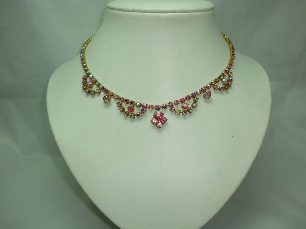 We are pleased to offer this lovely vintage 1950s sparkling pink ab diamante drop goldtone necklace which is just fab.  As you can see from the photos, the necklace is in excellent condition, all stones intact, original and clawed.  The necklace really looks pretty on with loads of sparkle and shine!  A really good quality, vintage piece.