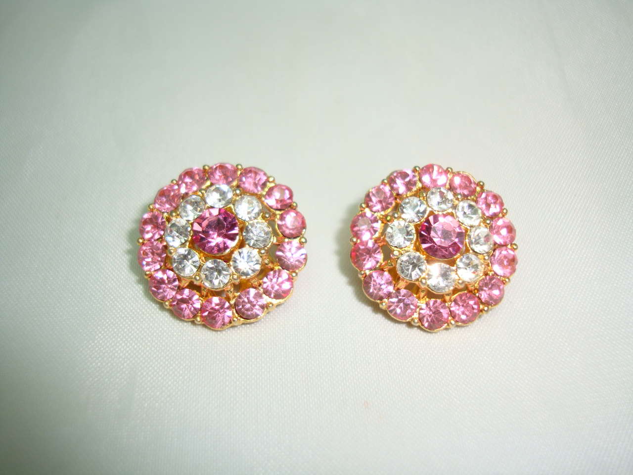 We are pleased to offer this pair of vintage 1950s sparkling pink and clear diamante flower shaped clip on goldtone earrings which are just fabulous.  Excellent condition, these do not look like they have ever been worn, loads of sparkle and shine, a really fab pair of vintage earrings.