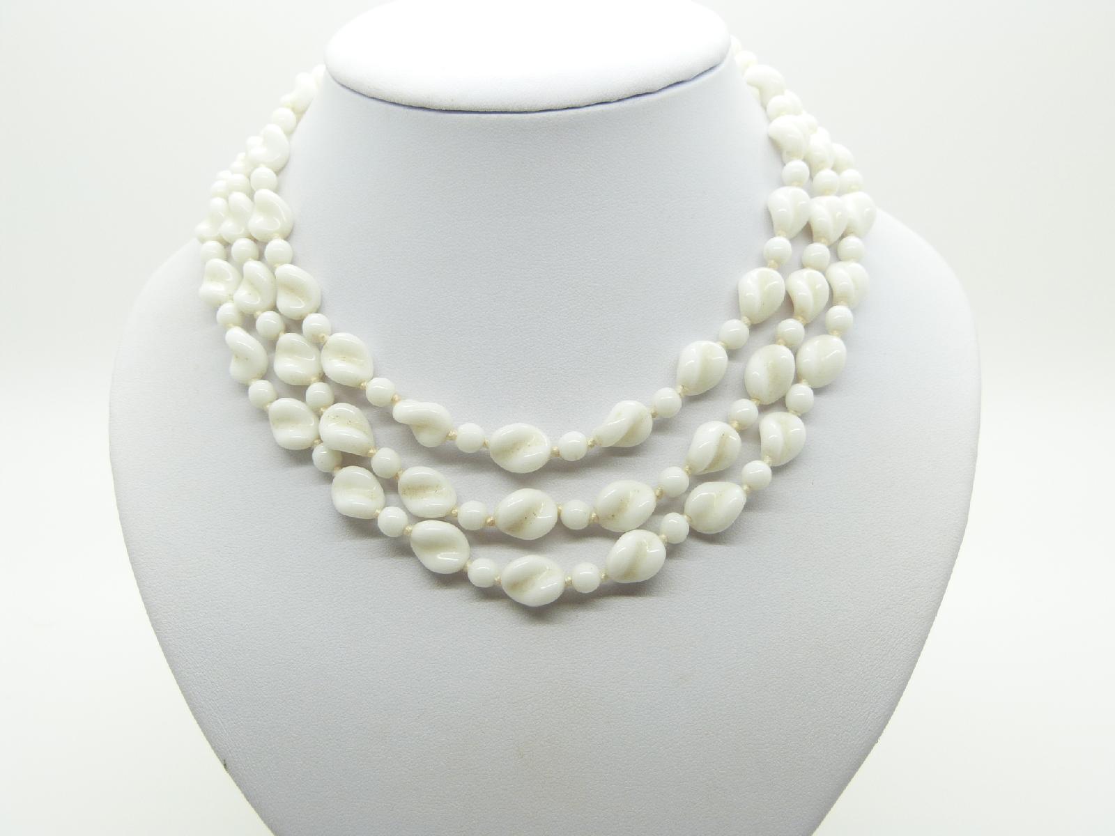 Vintage 50s Pretty Three Row White Glass Swirl Bead Necklace Length 46cms