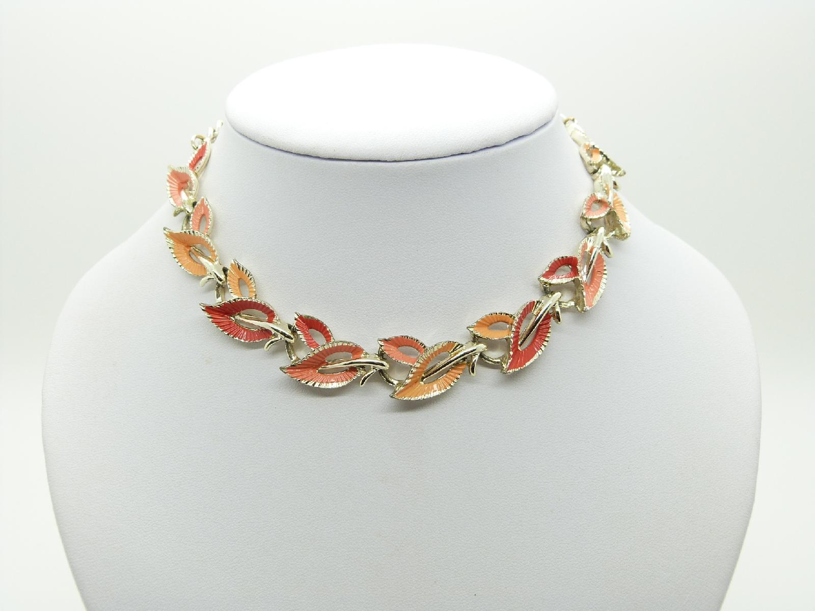 Vintage 50s signed Jewelcraft (on reverse of necklace), two tone orange enamel goldtone fancy link necklace.  Excellent condition, looks very pretty on, measures 43cms including extender chain.