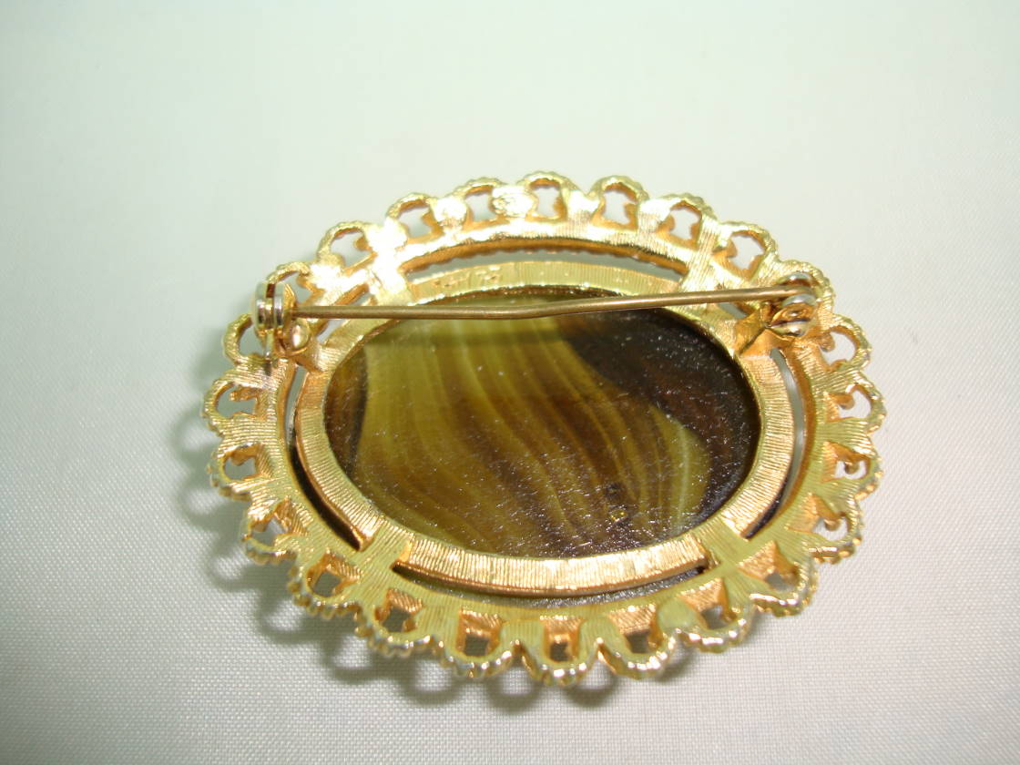 Vintage 50s Signed Sphinx Large Domed Green Agate Glass Gold Brooch