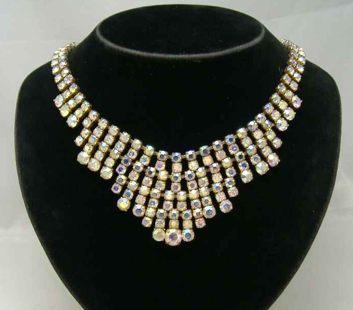 Vintage 50s Sparkling AB Diamante Festoon Bib Gold Necklace WOW