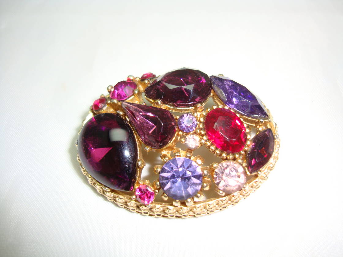 We are pleased to offer this stunning vintage 1950s Sphinx oval goldtone domed brooch set with a mixture of cabouchon glass and diamante stones in varying shades of purple and pink.  Stamped Sphinx on reverse with registration numbers, excellent vintage condition, looks super on, a great collectible vintage brooch.