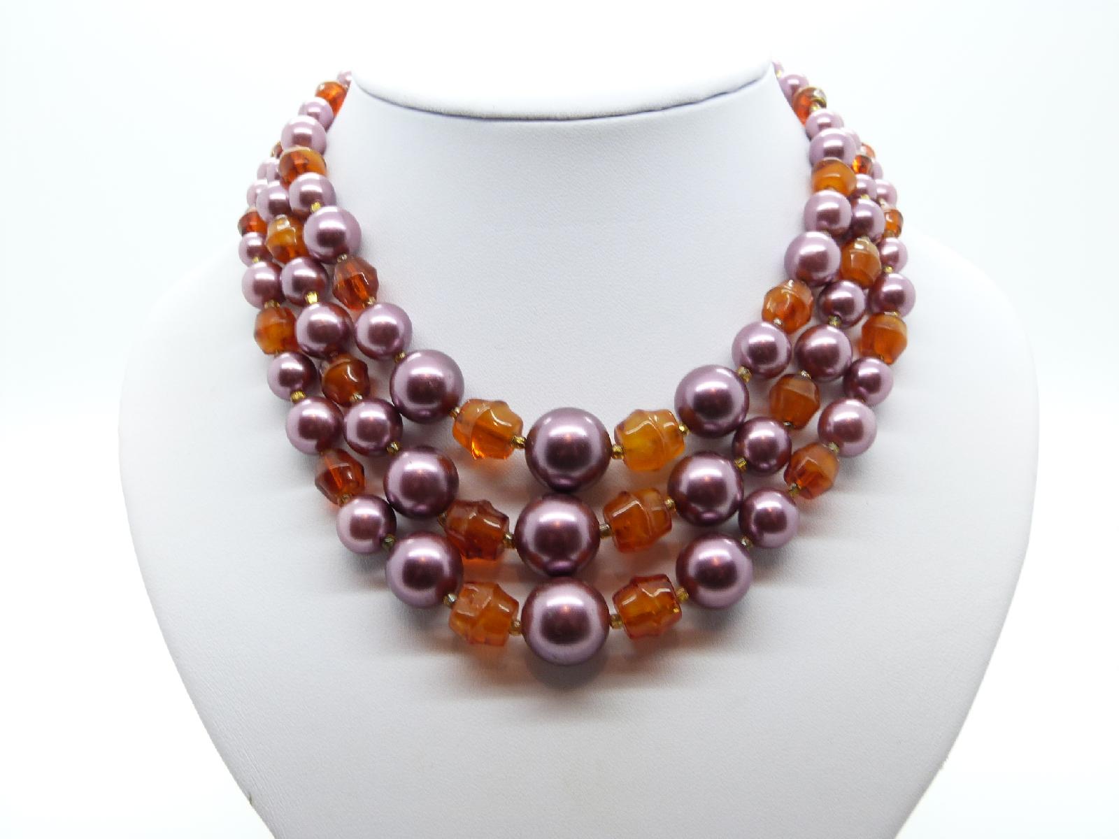 Vintage 50s Three Row Amber Glass and Purple Glass Faux Pearl Bead Necklace