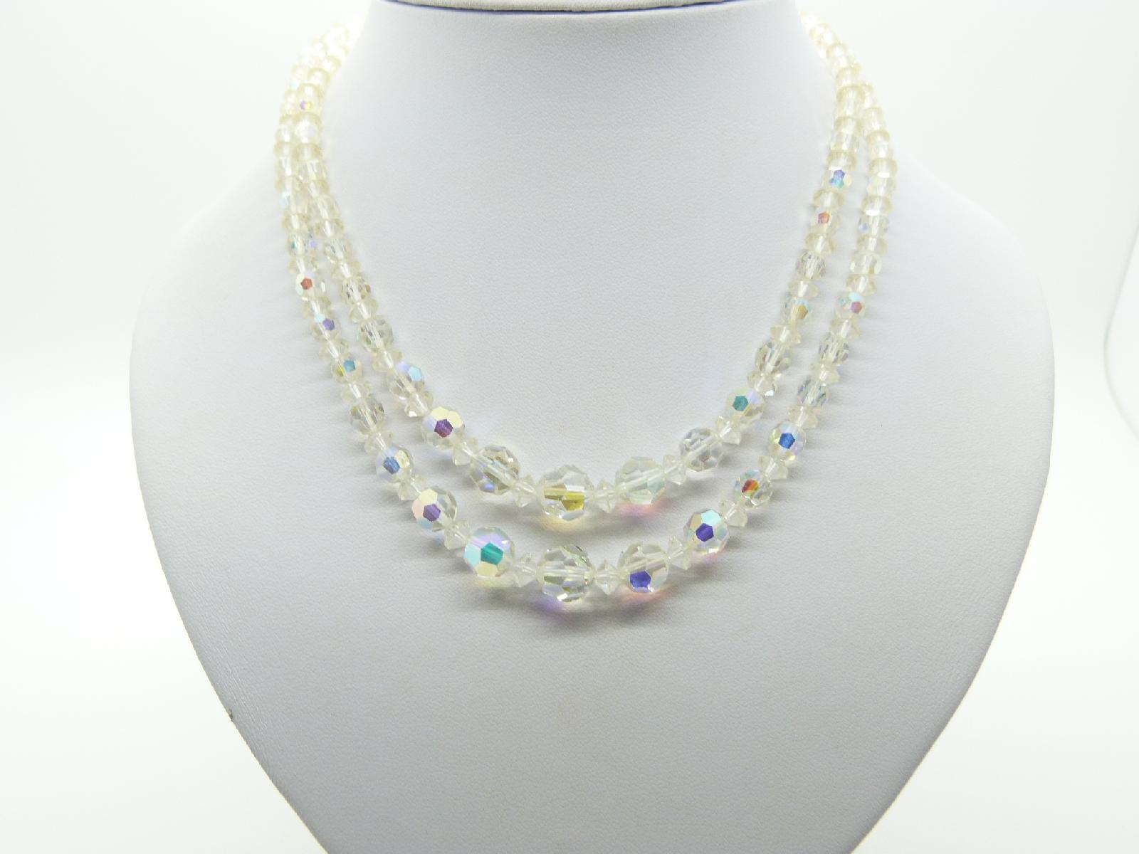 Vintage 50s Two Row AB Crystal Glass Bead Necklace with Diamante Ends