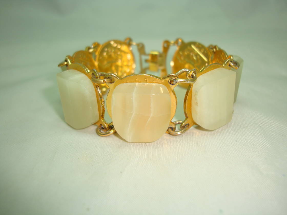 Vintage 50s Unusual Lemon Marble Glass Reverse Gold Coin Link Bracelet