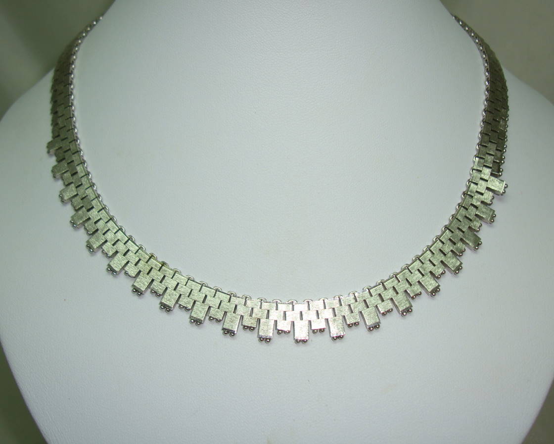 I am pleased to offer this quality vintage 1960s modernist design textured silvertone collar necklace which is just stunning.  This necklace is in excellent vintage condition and can be worn two ways - one side has a polished smooth finish and the other side is a textured matte finish.  This necklace has a really good weight to it and is very believable, looks like the real thing.  Fastens with push in fastener with little security clip on side.  Sits very beautifully around neckline, looks stunning!